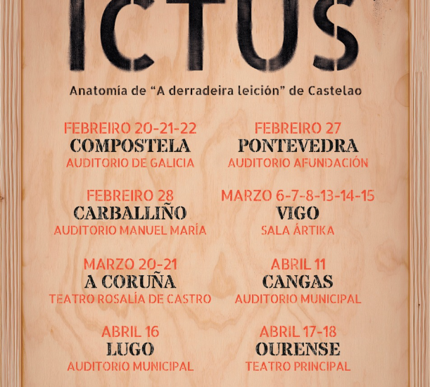 Estas son algunhas das datas da xira de Ictus, Anatomía de “A derradeira leición” de Castelao: -Compostela: 20, 21 e 22 de febreiro-Pontevedra: 27 de febreiro-Vigo: 6, 7, 8, 13, 14 e 15 de marzo-Cangas: 11 de abril Igual que os anteriores, este espectáculo contará con lingua de signos e audiodescrición.LER MÁIS