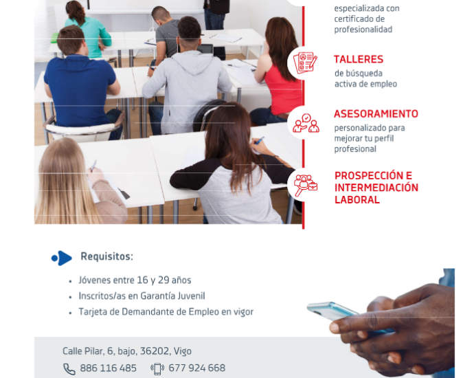 Proxecto formativo dirixido a mozos e mozas inscritos/as no Sistema Nacional de Garantía Xuvenil, no marco do Programa FSE+ de Emprego Xuvenil 2021–2027.O proxecto ten como obxectivo mellorar a empregabilidade da xente nova mediante formación acreditada, acompañamento personalizado e intermediación laboral. Qué ofrecemos?📚 Itinerarios formativos especializadosFormación orientada a obter CertificadosLER MÁIS
